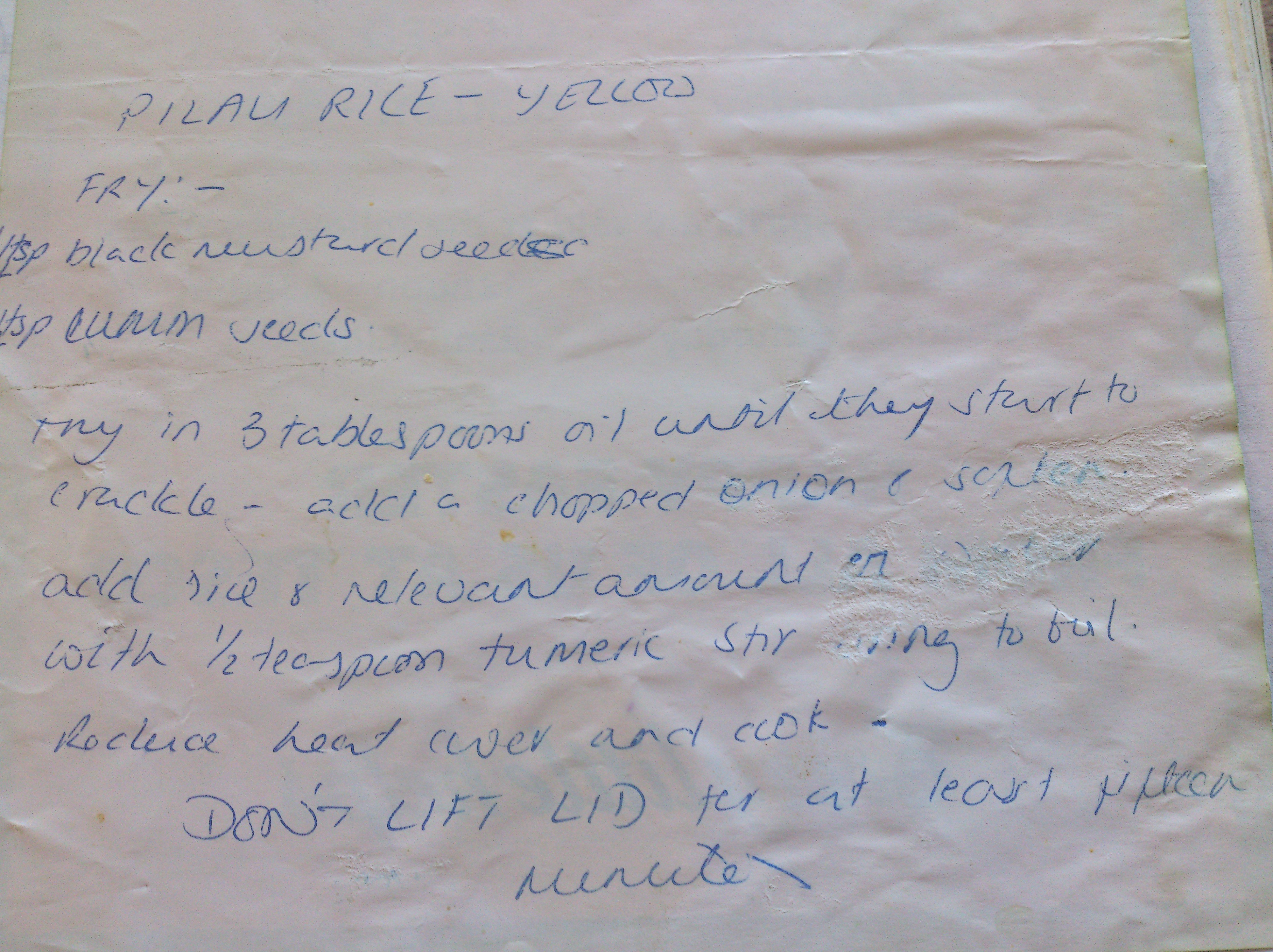 On the back of a handy Tesco flyer (‘Easter Opening Hours, April 1995’), the mother gave me the first Indian recipe I’d ever owned. Several decades later, I still have that piece of paper (pasted into a foodie diary of all the meals we shared with daughter Mia in her first year). As a family, we’ve cooked dozens, maybe hundreds of times from that Tesco flyer – and it’s never given us anything less than perfect rice for our table.