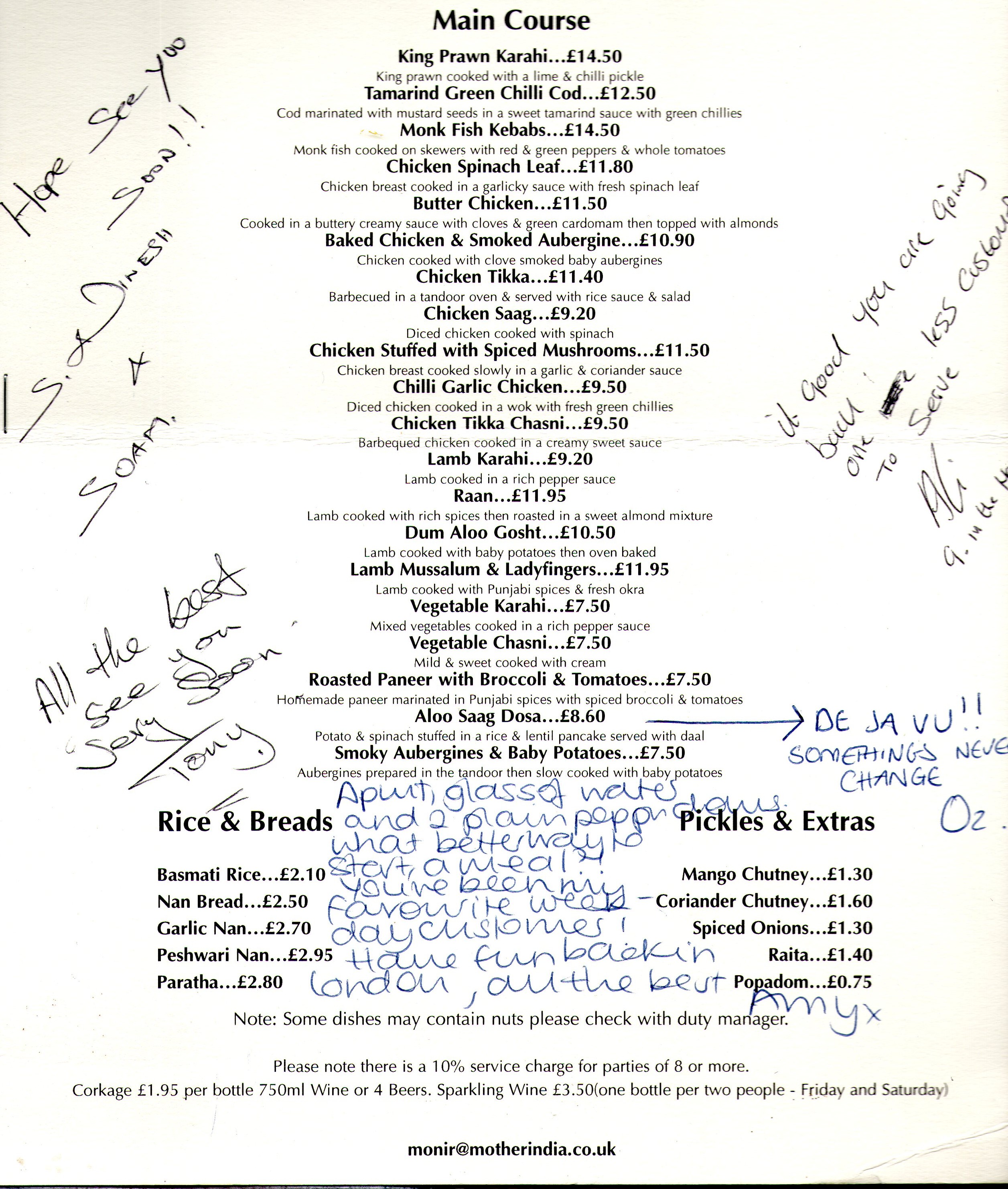 They gave a me a pint of Kingfisher, and just before I left they gave me a copy of the day’s menu, signed by Ali, Amy, Dinesh, Oz, Soam and Tony – with all the messages you can read above.